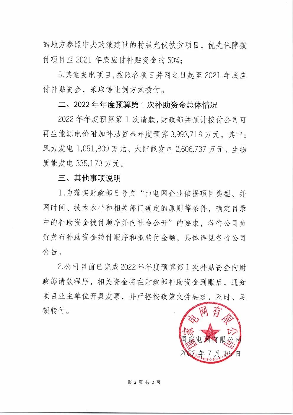 7月15日,國(guó)家電網(wǎng)公司發(fā)布《國(guó)家電網(wǎng)有限公司關(guān)于2022年年度預(yù)算第1次可再生能源電價(jià)附加補(bǔ)助資金撥付情況的公告》,發(fā)布2022年第一批補(bǔ)貼資金!文件指出:2022年年度預(yù)算第1次請(qǐng)款,財(cái)政部共預(yù)計(jì)撥付公司可再生能源電價(jià)附加補(bǔ)助資金年度預(yù)算3,993,719萬(wàn)元,其中:風(fēng)力發(fā)電1,051,809萬(wàn)元、太陽(yáng)能發(fā)電 2,606,737萬(wàn)元、生物質(zhì)能發(fā)電335,173萬(wàn)元。
