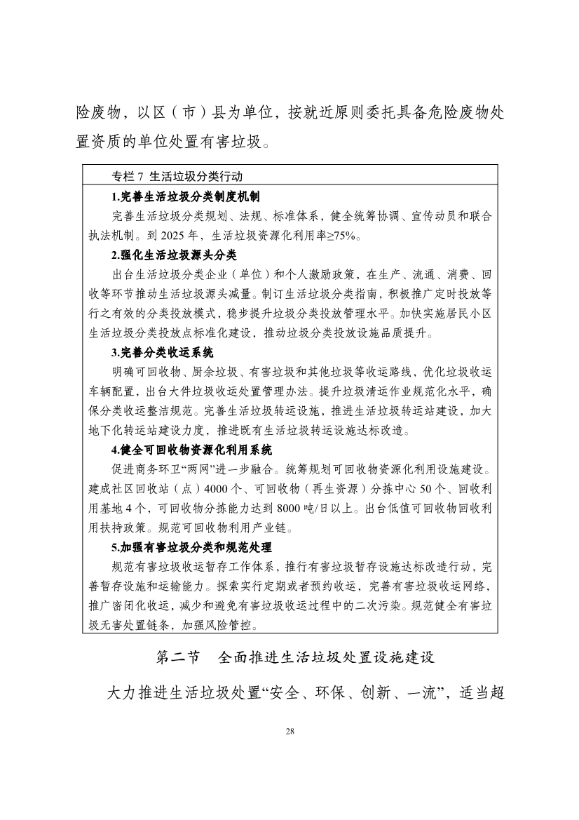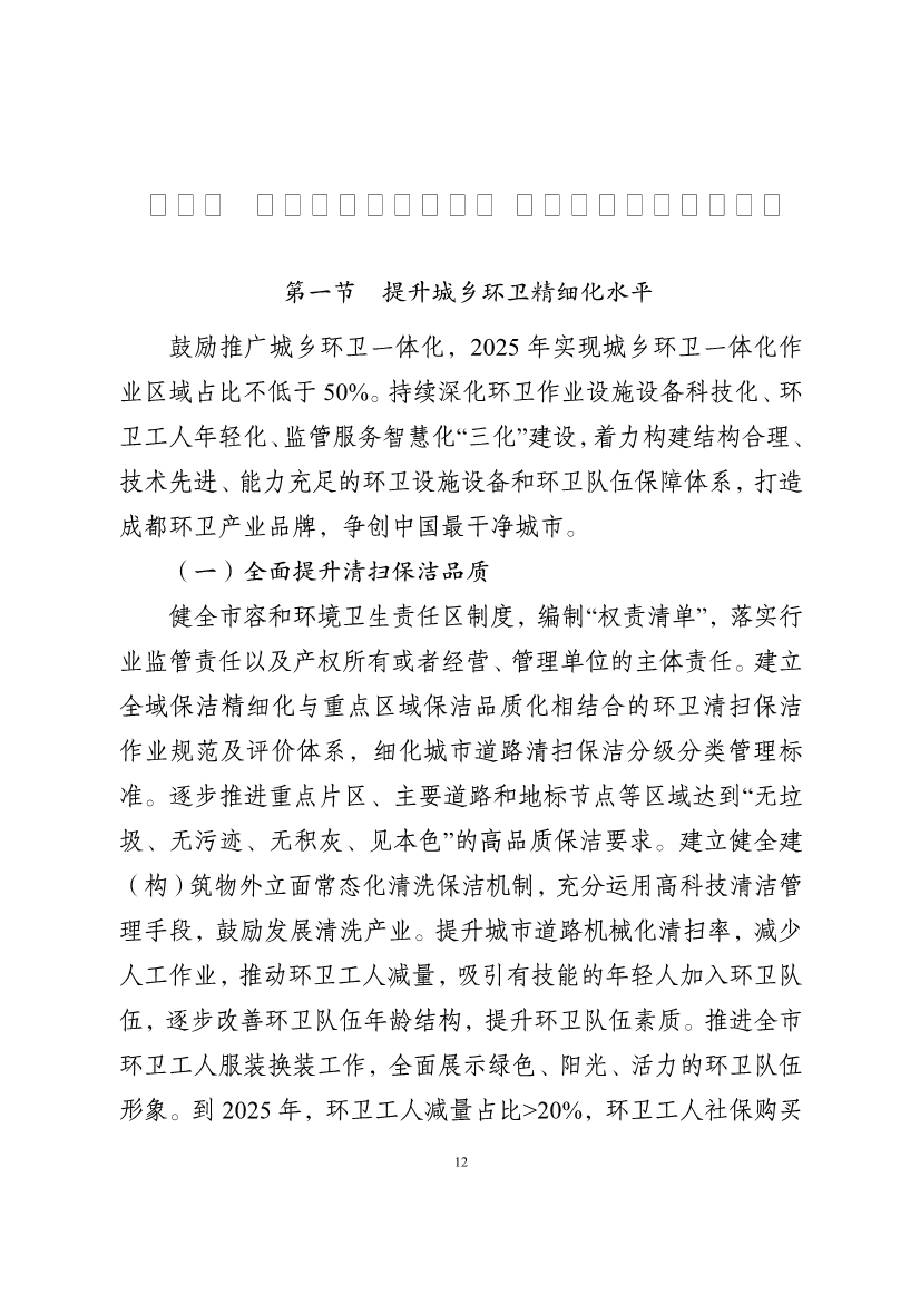 鼓勵(lì)推廣城鄉(xiāng)環(huán)衛(wèi)一體化,2025 年實(shí)現(xiàn)城鄉(xiāng)環(huán)衛(wèi)一體化作業(yè)區(qū)域占比不低于 50%。持續(xù)深化環(huán)衛(wèi)作業(yè)設(shè)施設(shè)備科技化、環(huán)衛(wèi)工人年輕化、監(jiān)管服務(wù)智慧化“三化”建設(shè),著力構(gòu)建結(jié)構(gòu)合理、技術(shù)先進(jìn)、能力充足的環(huán)衛(wèi)設(shè)施設(shè)備和環(huán)衛(wèi)隊(duì)伍保障體系,打造成都環(huán)衛(wèi)產(chǎn)業(yè)品牌,爭(zhēng)創(chuàng)中國(guó)最干凈城市。