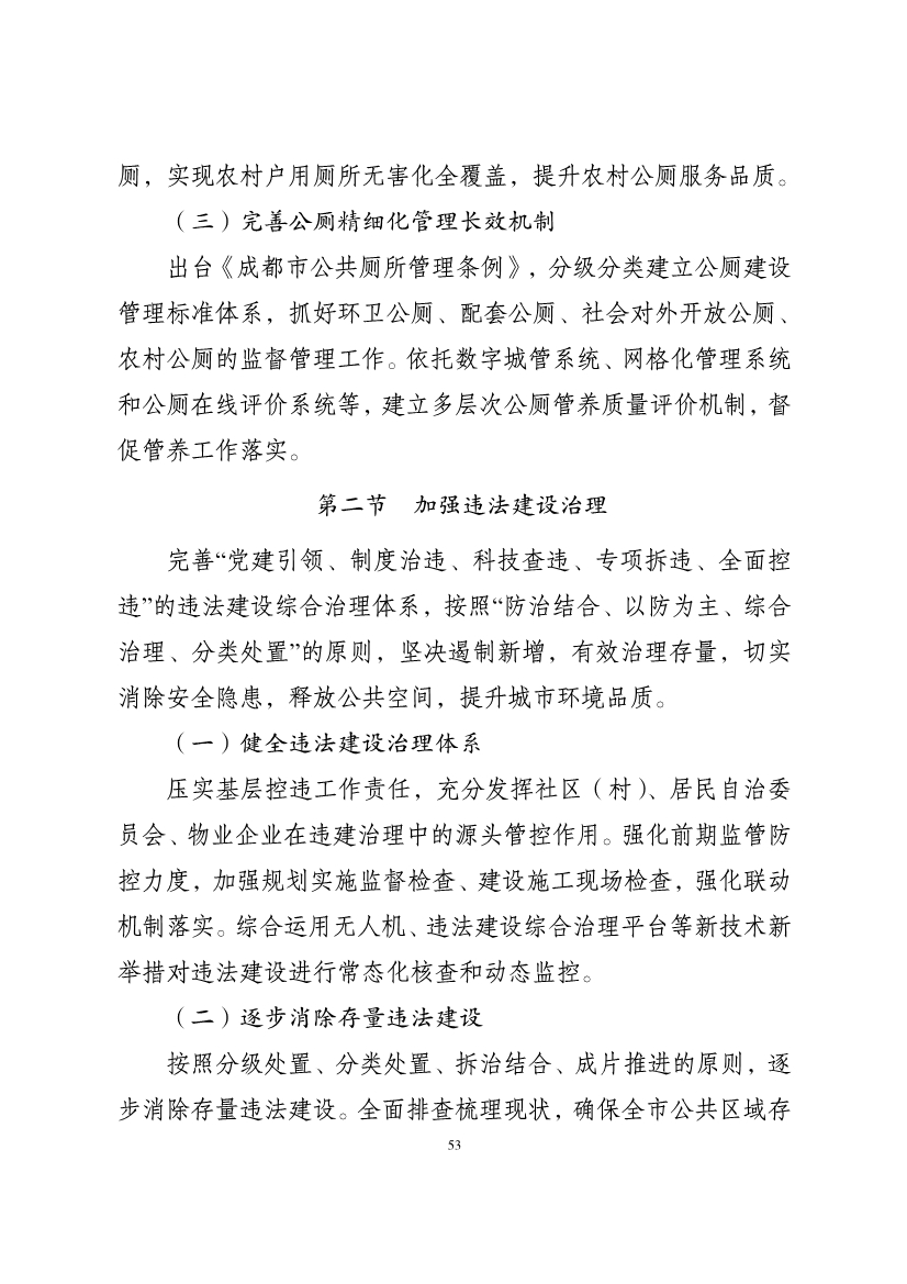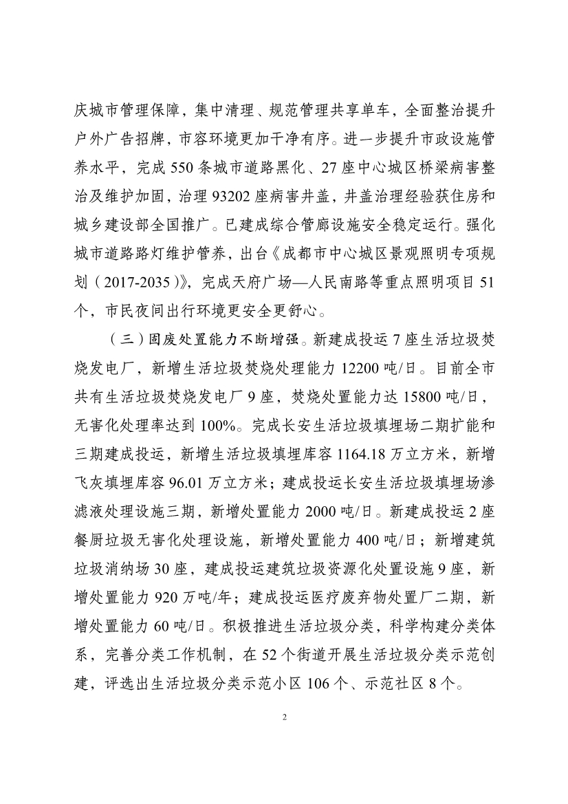 《規(guī)劃》明確,到2025年,成都生活垃圾無(wú)害化處理率達(dá)100%,“有路無(wú)燈、有燈不亮”問(wèn)題動(dòng)態(tài)清零率達(dá)100%,建成區(qū)公廁密度達(dá)5-6座/k㎡,完成“兩拆一增”整治點(diǎn)位不少于5000個(gè),背街小巷品質(zhì)提升不少于600條。