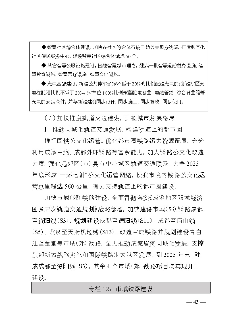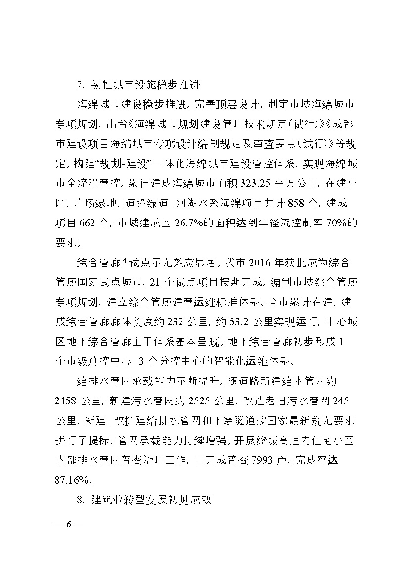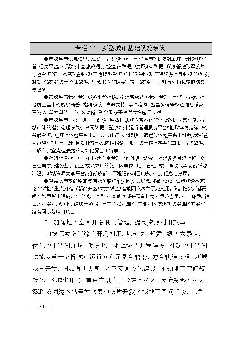 推進地下綜合管廊成網。持續(xù)推進地下綜合管廊與道路一體化建設,中心城區(qū)加快“環(huán)+射”綜合管廊布局成網,天府新區(qū)加快“六橫五縱”綜合管廊布局成網,東部新區(qū)重點推進“三橫一縱”綜合管廊布局成網。周邊區(qū)(市)縣按照管廊專項規(guī)劃要求,結合區(qū)域交通性干道、商業(yè)核心區(qū)道路建設等統(tǒng)籌實施地下綜合管廊。統(tǒng)一建立地下綜合管網基礎信息庫,提升智慧化管理水平,完善地下綜合管廊智能監(jiān)控“1+2+N”智能管理體系14,建立規(guī)劃、設計、施工、運維管理各階段數據為一體的地下綜合管廊“全生命周期管理”模式。