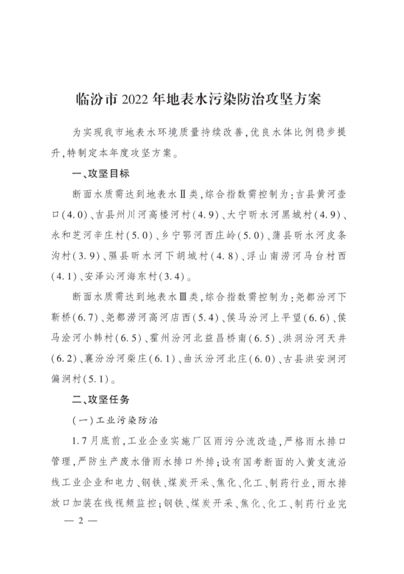 臨汾市2022年地表水污染防治攻堅(jiān)方案
