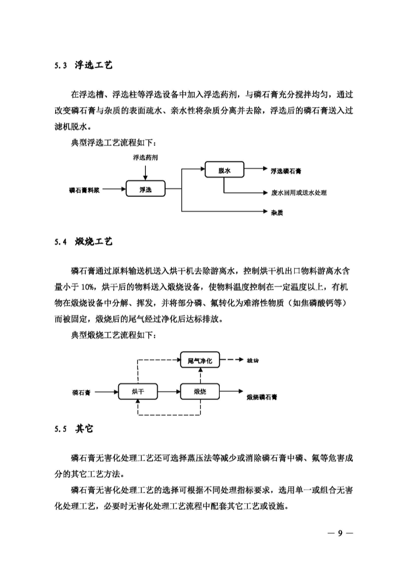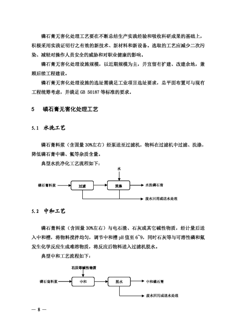 《技術(shù)規(guī)程》提出,磷石膏經(jīng)過(guò)水洗、中和、浮選、煅燒等各種工藝處理,使其滿足綜合利用相關(guān)標(biāo)準(zhǔn)要求并綜合利用,或按照規(guī)定達(dá)到第Ⅰ類(lèi)一般工業(yè)固體廢物標(biāo)準(zhǔn)要求的過(guò)程。磷石膏經(jīng)過(guò)無(wú)害化處理后,滿足綜合利用相關(guān)標(biāo)準(zhǔn),應(yīng)優(yōu)先綜合利用。磷石膏無(wú)害化處理工藝包括水洗工藝、中和工藝、浮選工藝、煅燒工藝、其他工藝5種。磷石膏無(wú)害化處理工藝的選擇可根據(jù)不同處理指標(biāo)要求,選用單一或組合無(wú)害化處理工藝,必要時(shí)無(wú)害化處理工藝流程中配套其他工藝或設(shè)施。