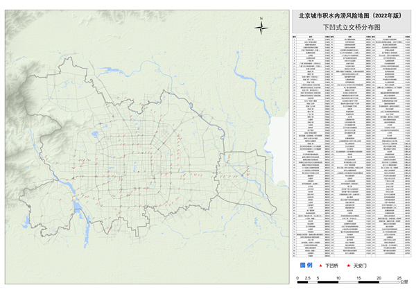 由于下凹式立交橋的天然屬性,極端天氣下較易產(chǎn)生積水,為提示下凹式立交橋低洼區(qū)域易產(chǎn)生積水的風(fēng)險(xiǎn),會(huì)同北京市交通委員會(huì)統(tǒng)計(jì)出區(qū)域內(nèi)下凹式立交橋共244座,在圖中標(biāo)出,供使用者參考。