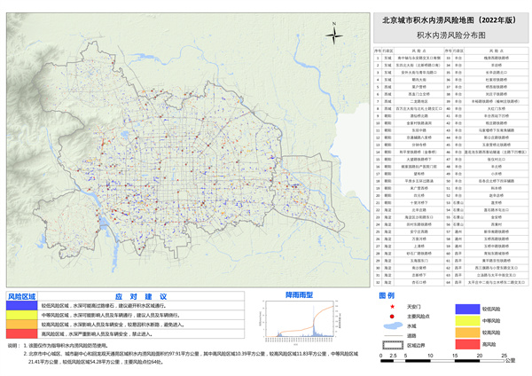 本次發(fā)布的積水內(nèi)澇風(fēng)險(xiǎn)地圖主要針對(duì)下凹橋區(qū)、市政主干道路等易產(chǎn)生積水內(nèi)澇風(fēng)險(xiǎn)的區(qū)域,通過(guò)梳理近十年積水內(nèi)澇風(fēng)險(xiǎn)點(diǎn)臺(tái)賬,同時(shí)輔助水文水動(dòng)力模型、大數(shù)據(jù)統(tǒng)計(jì)等技術(shù),采用“風(fēng)險(xiǎn)分布圖+信息列表”相結(jié)合的表達(dá)方式,形成覆蓋北京市中心城區(qū)、城市副中心和回龍觀天通苑區(qū)域積水內(nèi)澇風(fēng)險(xiǎn)地圖,面向社會(huì)公眾發(fā)布使用,由于降雨的不確定性、模型的有限性以及城市建設(shè)變化的影響,難以精準(zhǔn)覆蓋全部風(fēng)險(xiǎn)情況,圖中所列的積水內(nèi)澇風(fēng)險(xiǎn)僅涵蓋了歷史上發(fā)生過(guò)或通過(guò)模型模擬的可能發(fā)生的積水內(nèi)澇風(fēng)險(xiǎn),僅作為汛期積水內(nèi)澇風(fēng)險(xiǎn)提示的參考工具之一。