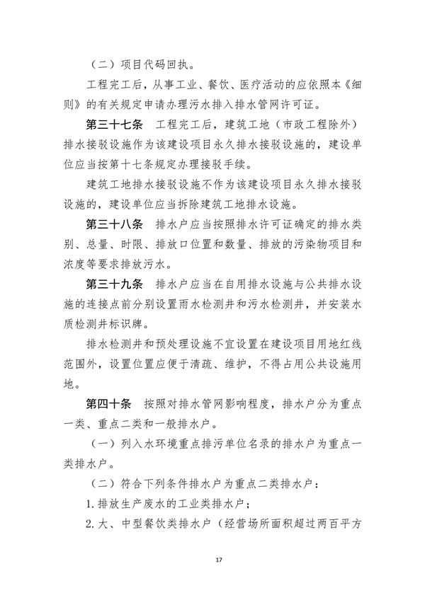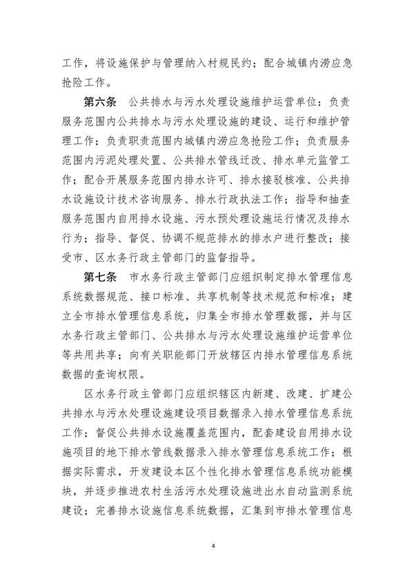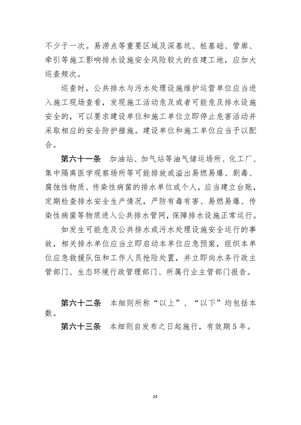 《細則》共計四章六十三條,主要是對《廣州市排水條例》相關原則、規(guī)定進行補充和完善、具體解釋,更好的指導廣州市排水的規(guī)劃、建設、管理、維護及應急等方面工作。明確市、區(qū)水務行政主管部門、鎮(zhèn)街、村居及公共排水與污水處理設施維護運營單位在廣州市排水管理工作中的職責,強調(diào)市相關部門共同推進排水管理重點工作職責。細化了排水工程在規(guī)劃、建設、維護管理方面的職責分工、技術要求和相關規(guī)定,以及大型排水設施的相關保護要求和規(guī)定。細化了各行業(yè)、排水戶的污水排放、接駁標準,及技術管理要求,明確其排水許可申請、辦理程序的材料、手續(xù)流程、方法以及有關規(guī)定。