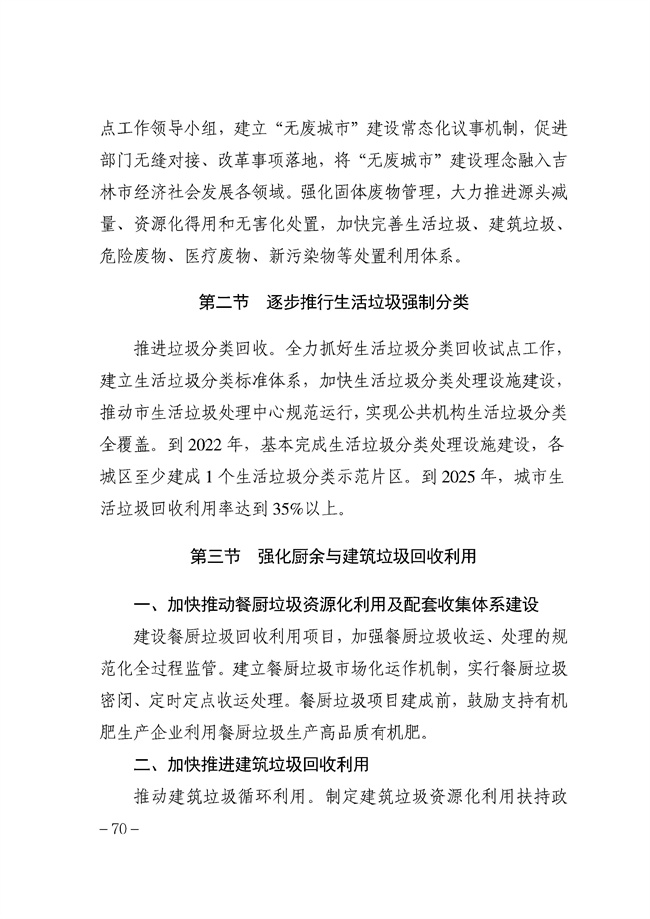 日前,吉林市人民政府辦公室關(guān)于印發(fā)吉林市生態(tài)環(huán)境保護(hù)“十四五”規(guī)劃的通知吉市政辦發(fā)〔2022〕12號(hào)發(fā)布,該規(guī)劃指出,控制溫室氣體排放、推動(dòng)制定碳達(dá)峰行動(dòng)方案,逐步推行生活垃圾強(qiáng)制分類,到2025年,全市揮發(fā)性有機(jī)物重點(diǎn)工程減排量達(dá)到5500噸。到2025年,全市基本消除城市建成區(qū)生活污水直排口和收集處理設(shè)施空白區(qū),污水收集處理率達(dá)到98%。到2025年,基 本實(shí)現(xiàn)農(nóng)村生活垃圾收運(yùn)處置體系全覆蓋。詳情如下: