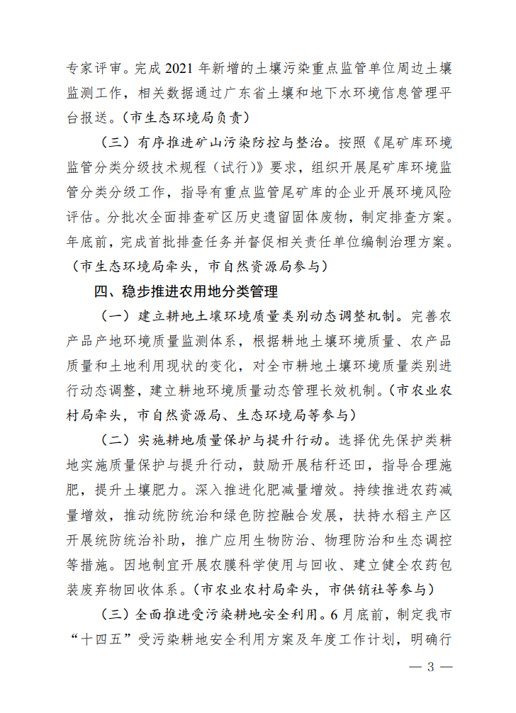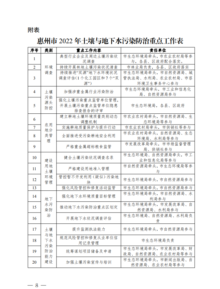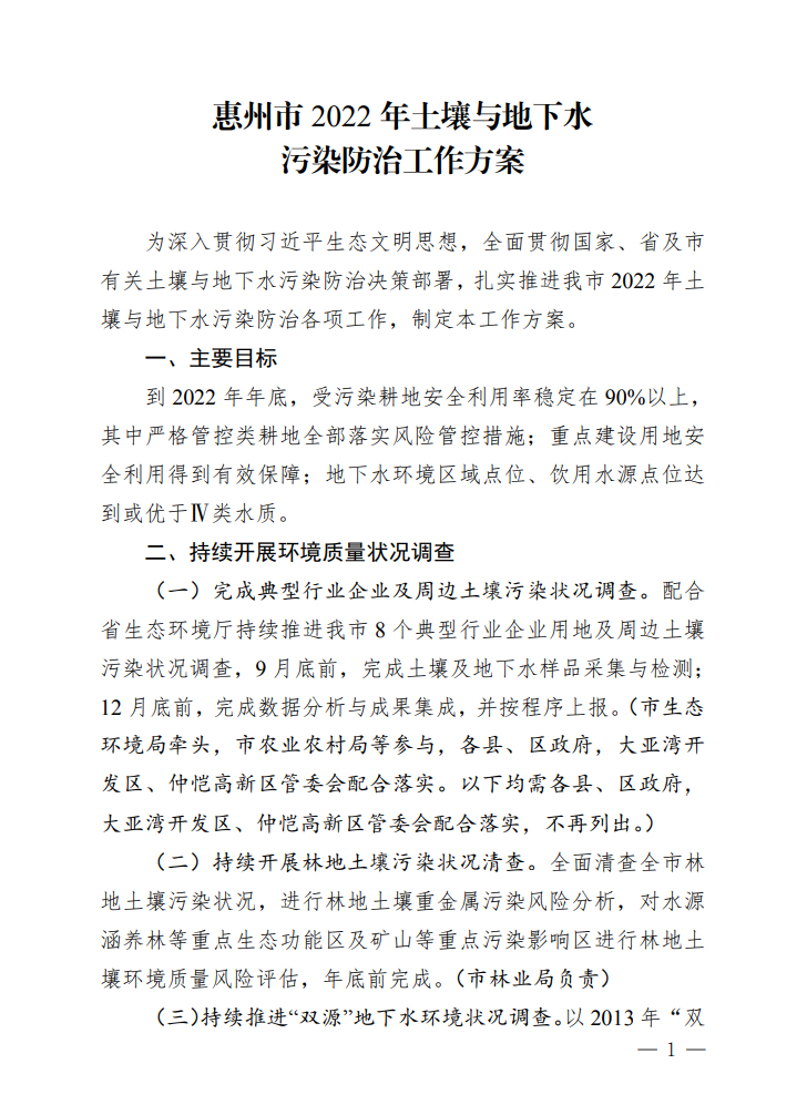 惠州市生態(tài)環(huán)境局印發(fā)《惠州市2022年土壤與地下水污染防治工作方案》,本著堅(jiān)持保護(hù)優(yōu)先、預(yù)防為主、風(fēng)險(xiǎn)管控等原則,保障受污染耕地安全利用、重點(diǎn)建設(shè)用地安全利用、地下水環(huán)境區(qū)域點(diǎn)位和飲用水源點(diǎn)位水質(zhì)為目標(biāo),為惠州市順利進(jìn)行土壤和地下水污染防治工作開(kāi)好局。主要包括持續(xù)開(kāi)展環(huán)境質(zhì)量狀況調(diào)查,加強(qiáng)土壤污染源頭防控,穩(wěn)步推進(jìn)農(nóng)用地分類管理,強(qiáng)化建設(shè)用地土壤環(huán)境管理,推進(jìn)地下水污染防治,強(qiáng)化土壤與地下水污染防治能力建設(shè)等六方面內(nèi)容。