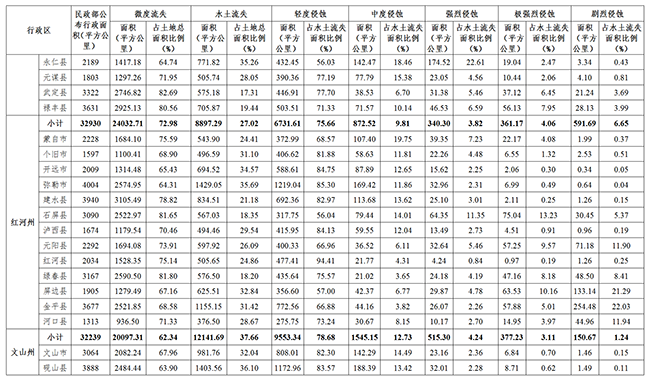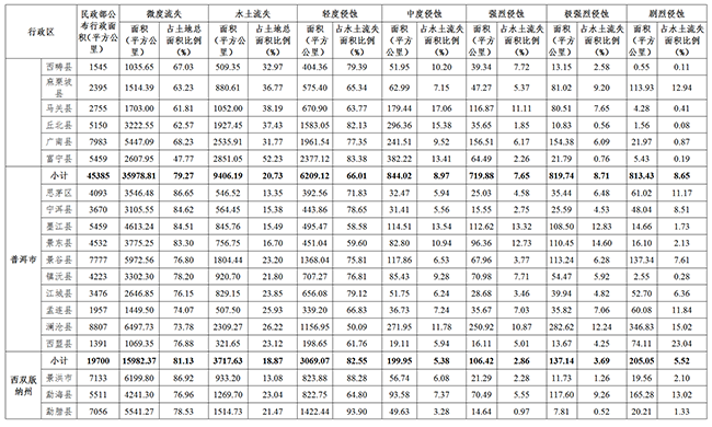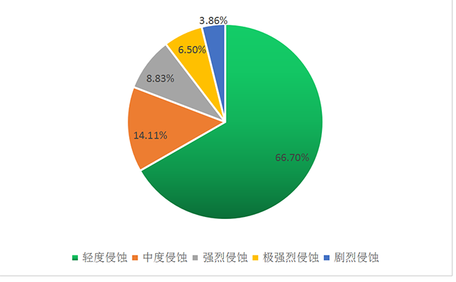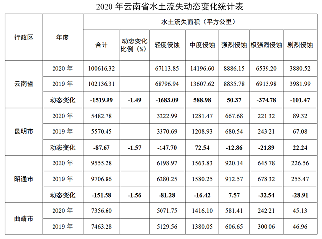 2020年,據(jù)全省水土流失動態(tài)監(jiān)測成果顯示,云南省水土流失面積10.06萬平方公里,占土地總面積39.40萬平方公里的25.54%。其中,輕度侵蝕面積為6.71萬平方公里、中度侵蝕面積為1.42萬平方公里、強(qiáng)烈侵蝕面積為0.89萬平方公里、極強(qiáng)烈侵蝕面積為0.65萬平方公里、劇烈侵蝕面積為0.39萬平方公里。
