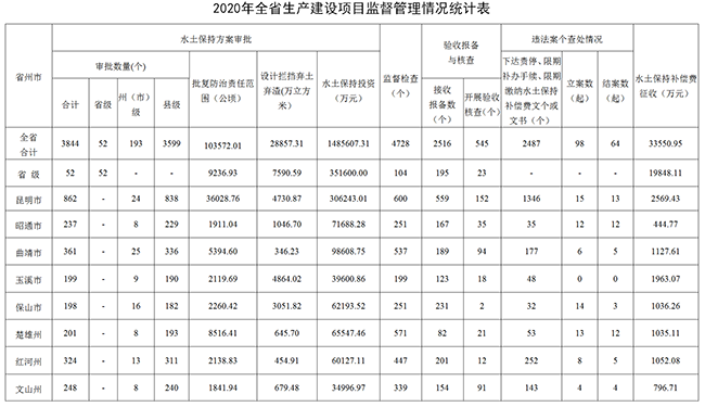 2020年,云南省共審批生產(chǎn)建設(shè)項(xiàng)目水土保持方案3844個,其中,省級審批52個,州(市)級審批193個,縣級審批3599個。設(shè)計水土保持資金148.56億元,防治責(zé)任范圍103572.01公頃,設(shè)計攔擋棄土棄渣28857.31萬立方米。