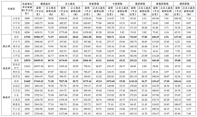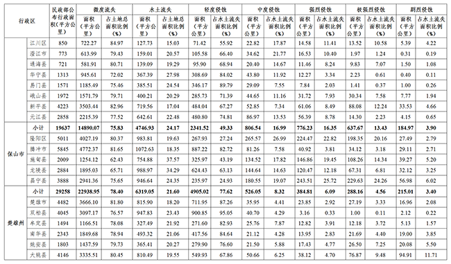 2020年全省水土流失總面積較2019年減少1519.99平方公里,其中:輕度侵蝕面積減少1683.09平方公里,中度侵蝕面積增加588.98平方公里,強(qiáng)烈侵蝕面積增加50.37平方公里,極強(qiáng)烈侵蝕面積減少374.78平方公里,劇烈侵蝕面積減少101.47平方公里。