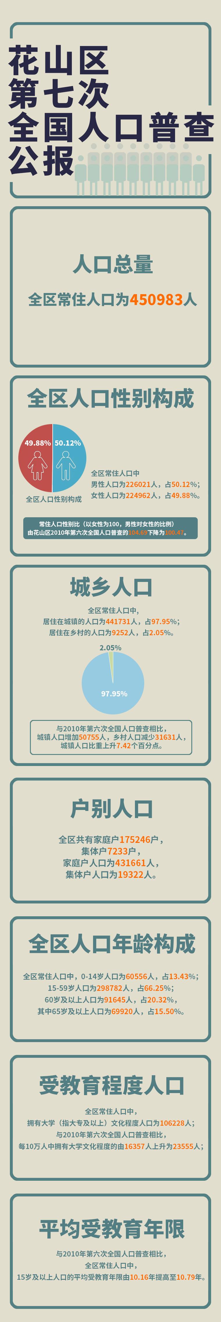 全區(qū)常住人口為450983人,與2010年花山區(qū)第六次全國人口普查的431859人相比,增加19124人,增長4.43%,年平均增長0.43%。