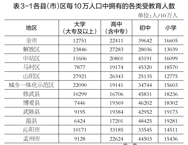 全市常住人口中,擁有大學(xué)(指大專及以上)文化程度的人口為448987人;擁有高中(含中專)文化程度的人口為789108人;擁有初中文化程度的人口為1395831人;擁有小學(xué)文化程度的人口為584666人(以上各種受教育程度的人包括各類學(xué)校的畢業(yè)生、肄業(yè)生和在校生)。與2010年第六次全國人口普查相比,每10萬人中擁有大學(xué)文化程度的由7607人上升為12751人;擁有高中文化程度的由18134人上升為22411人;擁有初中文化程度的由46201人下降為39642人;擁有小學(xué)文化程度的由18648人下降為16605人。