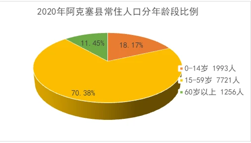 全縣常住人口中,0-14歲[人口為1993人,占18.17%;15-59歲人口為7721人,占70.38%;60歲及以上人口為1256人,占11.45%;其中65歲及以上人口為808人,占7.37%。與2010年第六次全國人口普查相比,0-14歲人口的比重上升1.43個百分點,15-59歲人口的比重下降6.56個百分點,60歲及以上人口的比重上升1.85個百分點,其中65歲及以上人口的比重上升3.73個百分點。