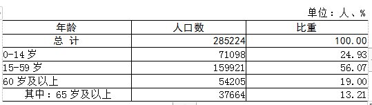 全縣常住人口中,0-14歲人口為71098人,占24.93 %;15-59歲人口為159921人,占56.07%;60歲及以上人口為54205人,占19.00%,其中65歲及以上人口為37664人,占13.21%。與2010年第六次全國人口普查相比,0-14歲人口的比重提高2.88個百分點(diǎn),15-59歲人口的比重下降8.71個百分點(diǎn),60歲及以上人口的比重提高5.83個百分點(diǎn),65歲及以上人口的比重上升3.50個百分點(diǎn)。