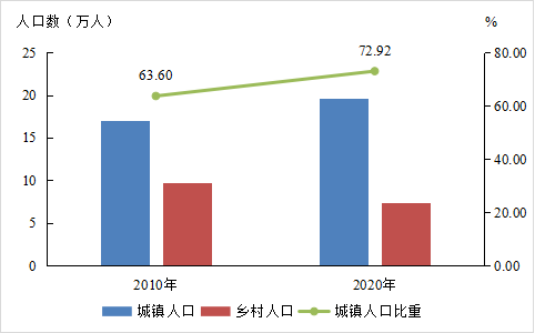 全區(qū)常住人口[3]中,居住在城鎮(zhèn)的人口為195605人,占72.92%;居住在鄉(xiāng)村的人口為73866人,占27.08%。與2010年第六次全國(guó)人口普查[4]相比,城鎮(zhèn)人口增加25498人,鄉(xiāng)村人口減少23490人,城鎮(zhèn)人口比重提高9.32個(gè)百分點(diǎn)。