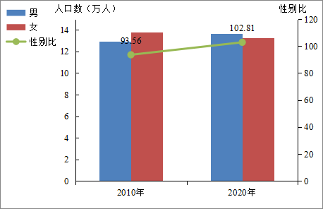 全區(qū)常住人口[2]中,男性人口為136601人,占50.69%;女性人口為132870人,占49.31%。人口性別比(以女性為100,男性對(duì)女性的比例)由2010年第六次全國(guó)人口普查的93.56上升為102.81。
