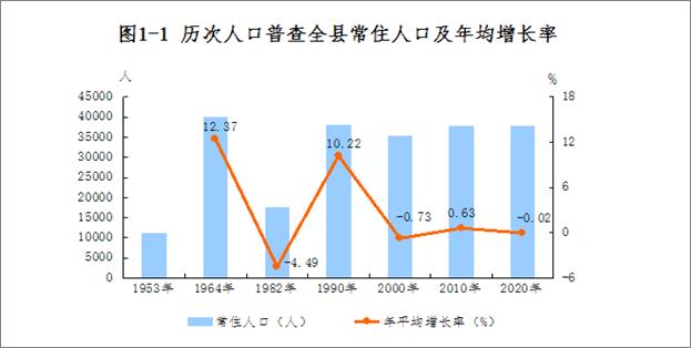 全縣共有常住人口[2]?37729?人,與2010年第六次全國人口普查的37788人相比,減少59人,下降0.16%,年平均增長率為-0.02%。