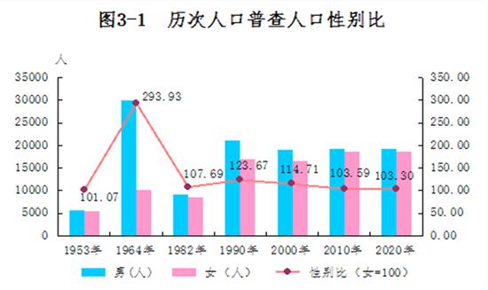 全縣常住人口[2]中,男性人口為19171人,占50.81%;女性人口為18558人,占49.19%??側丝谛詣e比(以女性為100,男性對女性的比例)為103.30,比2010年第六次全國人口普查時下降0.29。