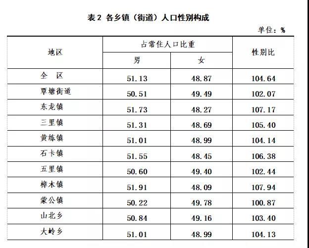 全區(qū)常住人口中,男性人口為216679人,占51.13%;女性人口為207068人,占48.87%。總?cè)丝谛詣e比(以女性為100,男性對女性的比例)為104.64,與2010年第六次全國人口普查的100.52相比上升4.12。