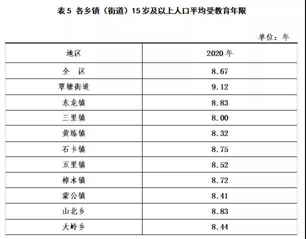 全區(qū)常住人口中,15歲及以上人口的平均受教育年限為8.67年。