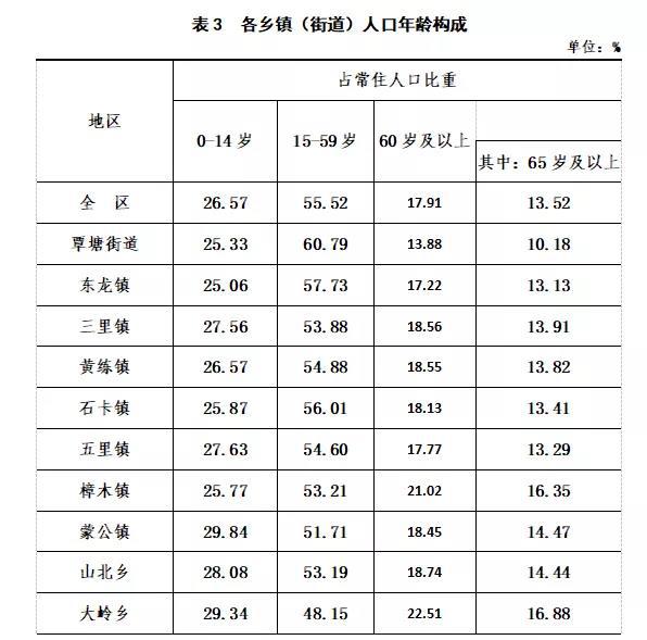 全區(qū)常住人口中,0-14歲[6]人口為112585人,占26.57%;15-59歲人口為235259人,占55.52%;60歲及以上人口為75903人,占17.91%,其中65歲及以上人口為57297人,占13.52%。與2010年第六次全國人口普查相比,0-14歲人口的比重下降1.79個百分點,15-59歲人口的比重下降1.82個百分點,60歲及以上人口的比重上升3.61個百分點,65歲及以上人口的比重上升3.32個百分點。