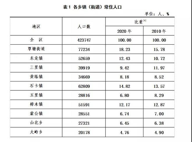 全區(qū)共有10個鄉(xiāng)鎮(zhèn)(街道),各鄉(xiāng)鎮(zhèn)(街道)常住人口分布如下:
