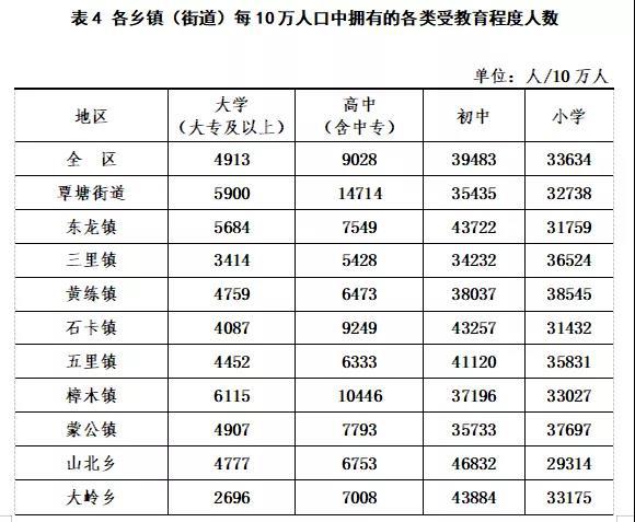 全區(qū)常住人口中,擁有大學(xué)(指大專及以上)文化程度的人口為20818人;擁有高中(含中專)文化程度的人口為38257人;擁有初中文化程度的人口為167309人;擁有小學(xué)文化程度的人口為142524人(以上各種受教育程度的人包括各類學(xué)校的畢業(yè)生、肄業(yè)生和在校生)。與2010年第六次全國人口普查相比,每10萬人中擁有大學(xué)文化程度的由2196人上升為4913人;擁有高中文化程度的由6611人上升為9028人;擁有初中文化程度的由38801人上升為39483人;擁有小學(xué)文化程度的由38310人下降為33634人。