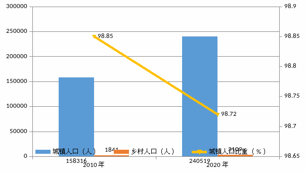 全區(qū)人口中,居住在城鎮(zhèn)的人口為240519人,占98.72%;居住在鄉(xiāng)村的人口為3109人,占1.28%。與2010年第六次全國人口普查相比,城鎮(zhèn)人口增加82143人,鄉(xiāng)村人口增加1268人,城鎮(zhèn)人口比重降低0.13個百分點。