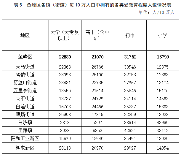 全區(qū)人口中,擁有大學(指大專及以上)文化程度的人口為153055人;擁有高中(含中專)文化程度的人口為140950人;擁有初中文化程度的人口為212475人;擁有小學文化程度的人口為105689人(以上各種受教育程度的人包括各類學校的畢業(yè)生、肄業(yè)生和在校生)。與2010年第六次全國人口普查相比,每10萬人中擁有大學文化程度的由14296人增加到22880人;擁有高中文化程度的由20246人增加到21070人;擁有初中文化程度的由38711人減少到31762人;擁有小學文化程度的由18793人減少到15799人(見表5)。