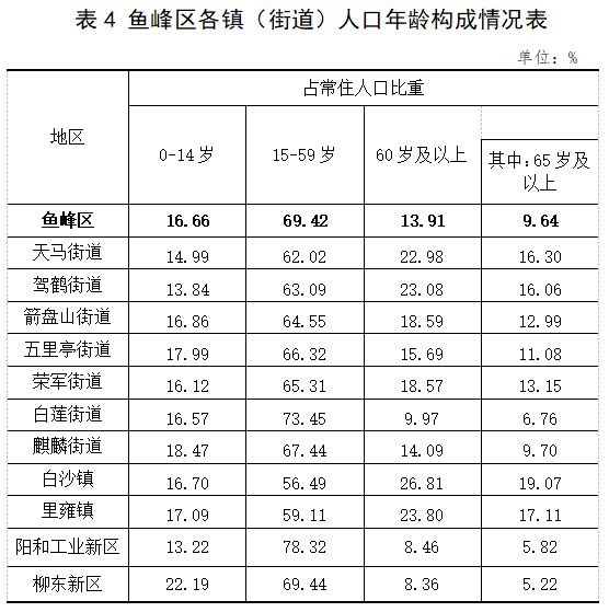 全區(qū)人口中,0-14歲[6]人口為111475人,占16.66%;15-59歲人口為464415人,占69.42%;60歲及以上人口為93071人,占13.91%,其中65歲及以上人口為64500人,占9.64%。與2010年第六次全國人口普查相比,0-14歲人口的比重上升2.14個百分點,15-59歲人口的比重下降4.96個百分點,60歲及以上人口的比重提高2.82個百分點,65歲及以上人口的比重提高2.36個百分點(見表4)。