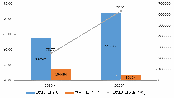全區(qū)人口中,居住在城鎮(zhèn)的人口為618827人,占92.51%;居住在鄉(xiāng)村的人口為50134人,占7.49%。與2010年第六次全國人口普查相比,城鎮(zhèn)人口增加231206人,鄉(xiāng)村人口減少54350人,城鎮(zhèn)人口比重提高4.74個百分點。