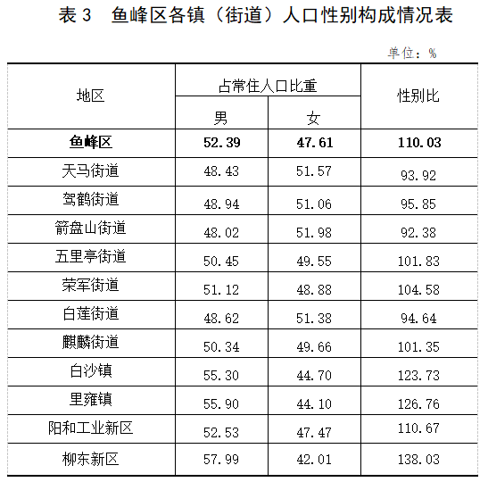 全區(qū)人口中,男性人口為350453人,占52.39%;女性人口為318508人,占47.61%。總?cè)丝谛詣e比(以女性為100,男性對女性的比例)為110.03,與2010年第六次全國人口普查的110.55相比下降0.52(見表3)。