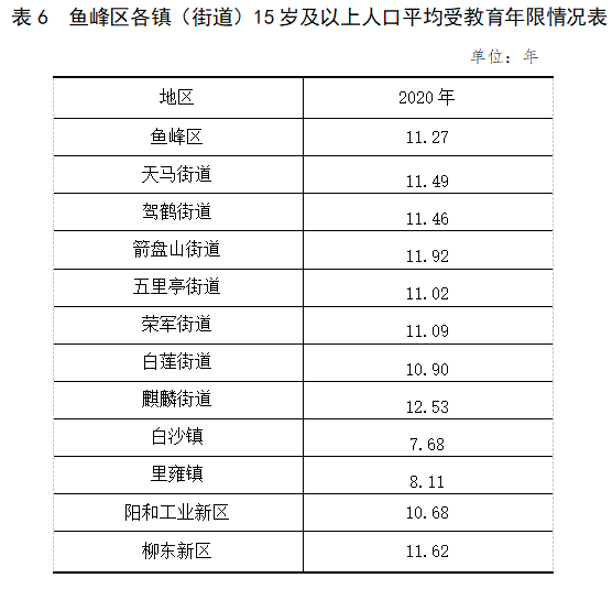 與2010年第六次全國人口普查相比,全區(qū)人口中,15歲及以上人口的平均受教育年限由10.91年增加至11.27年(見表6)。