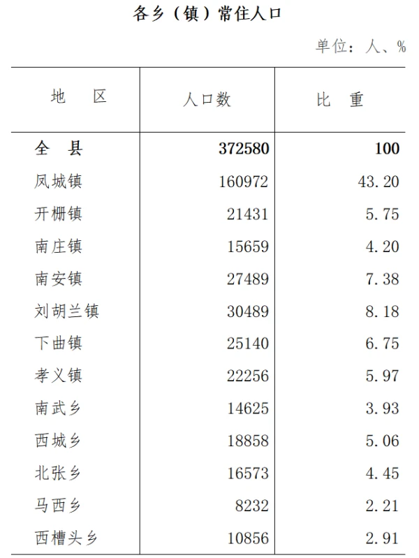 全縣常住人口[3]為372580人,與2010年第六次全國人口普查的421199人相比,十年間減少了48619人,減少11.54%,年平均增長(zhǎng)率-1.22%。