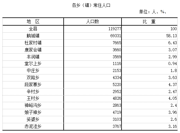 全縣常住人口[3]為119277人,與2010年第六次全國(guó)人口普查的156846人相比,十年間減少了37569人,減幅23.95%,年平均增長(zhǎng)率-2.70%。