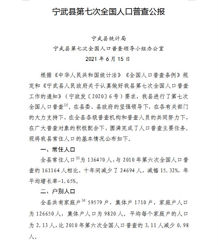寧武縣第七次全國(guó)人口普查公報(bào)