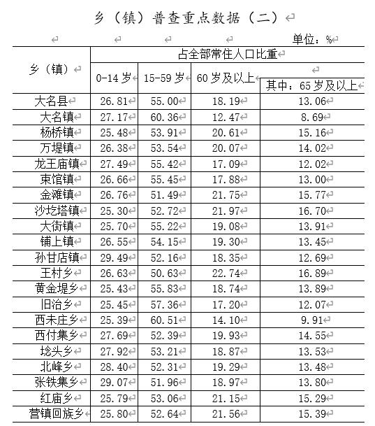 [3]常住人口包括:居住在本鄉(xiāng)(鎮(zhèn)、街道)、戶口在本鄉(xiāng)(鎮(zhèn)、街道)或戶口待定的人;居住在本鄉(xiāng)(鎮(zhèn)、街道)、離開戶口所在的鄉(xiāng)(鎮(zhèn)、街道)半年以上的人;戶口在本鄉(xiāng)(鎮(zhèn)、街道)、外出不滿半年或在境外工作學(xué)習(xí)的人。大名縣第七次全國人口普查公報