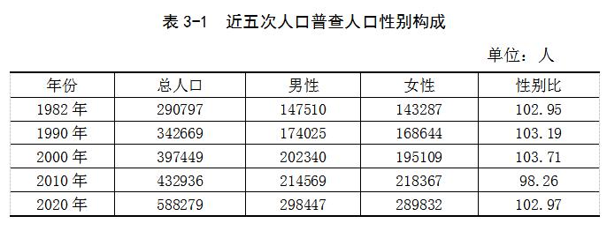 全區(qū)常住人口[2]中,男性人口為298447人,占50.73%;女性人口為289832人,占49.27%???cè)丝谛詣e比(以女性為100,男性對(duì)女性的比例)為102.97 ,比2010年第六次全國(guó)人口普查提高4.71個(gè)百分點(diǎn)。