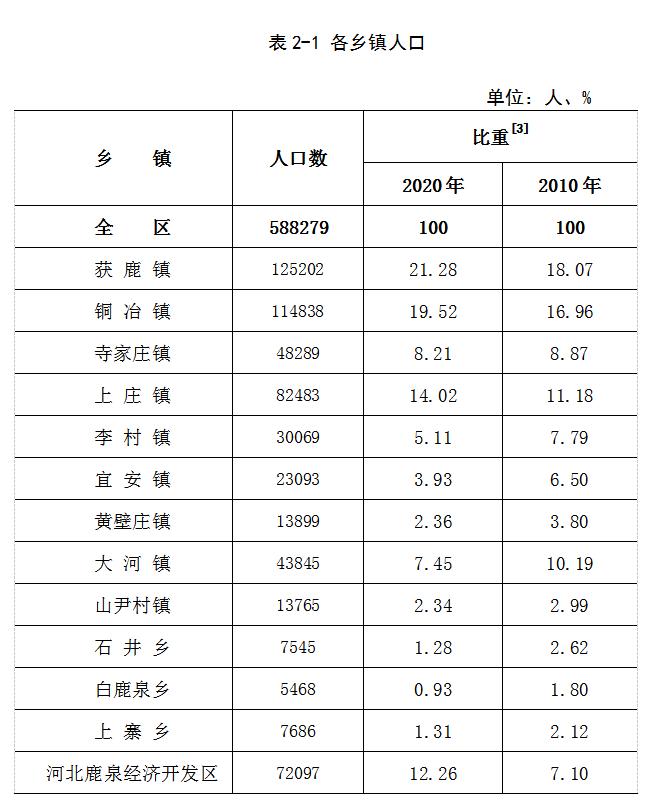 根據(jù)石家莊市鹿泉區(qū)第七次全國(guó)人口普查結(jié)果,現(xiàn)將2020年11月1日零時(shí)全區(qū)分鄉(xiāng)鎮(zhèn)的常住人口[2]有關(guān)數(shù)據(jù)公布如下: