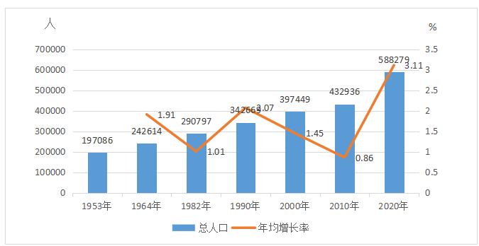 圖1-1 歷次人口普查總?cè)丝诩澳昃鲩L(zhǎng)率[3]