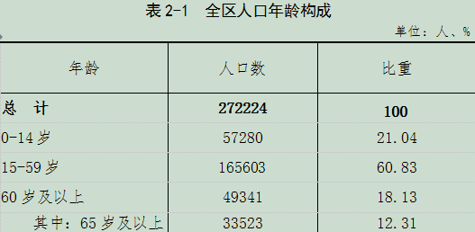全區(qū)常住人口[2]中,0-14歲人口為57280人,占21.04 %;15-59歲人口為165603人,占60.83 %;60歲及以上人口為49341人,占18.13%,其中65歲及以上人口為33523人,占12.31%。