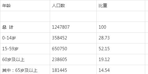 全市常住人口中,0-14歲人口為358452人,占28.73%;15-59歲人口為650750人,占52.15%;60歲及以上人口為238605人,占19.12%,其中65歲及以上人口為181445人,占14.54%。與2010年第六次全國(guó)人口普查相比,0-14歲人口的比重上升5.1個(gè)百分點(diǎn),15-59歲人口的比重下降12.21個(gè)百分點(diǎn),60歲及以上人口的比重上升7.12個(gè)百分點(diǎn),65歲及以上人口的比重上升6.95個(gè)百分點(diǎn)。