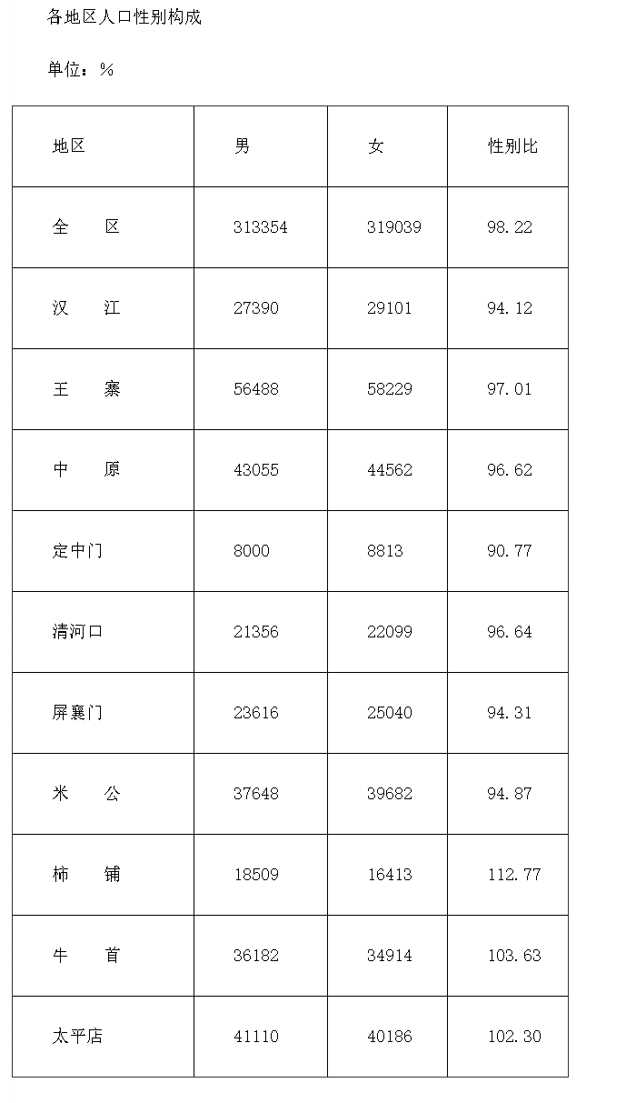 全區(qū)常住人口中,男性人口為313354人,占49.55%;女性人口為319039人,占50.45%。常住人口性別比(以女性為100,男性對女性的比例)為98.22,與2010年第六次全國人口普查99.17相比下降0.95個百分點。