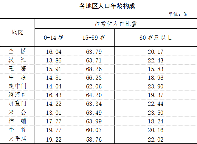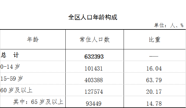 全區(qū)常住人口中,0-14歲人口為101431人,占16.04%;15-59歲人口為403388人,占63.79%;60歲及以上人口為127574人,占20.17%,其中65歲及以上人口為93449人,占14.78%。與2010年第六次全國人口普查相比,0-14歲人口的比重(14.50%)上升1.54個百分點,15-59歲人口的比重(73.24%)下降9.45個百分點,60歲及以上人口的比重(12.26%)上升7.91個百分點。