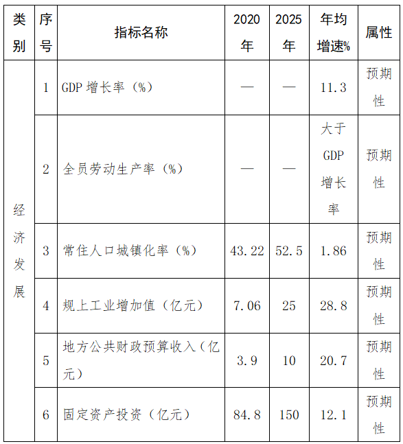 聚焦經(jīng)濟(jì)社會高質(zhì)量發(fā)展,到“十四五”末,全縣地區(qū)生產(chǎn)總值達(dá)到150億元,地方公共財政預(yù)算收入達(dá)到10億元,固定資產(chǎn)投資達(dá)到150億元,規(guī)模以上工業(yè)增加值達(dá)到25億元,社會消費品零售總額達(dá)到90億元,城鄉(xiāng)居民人均可支配收入分別達(dá)到4.69萬元、1.92萬元。具體指標(biāo)如下: