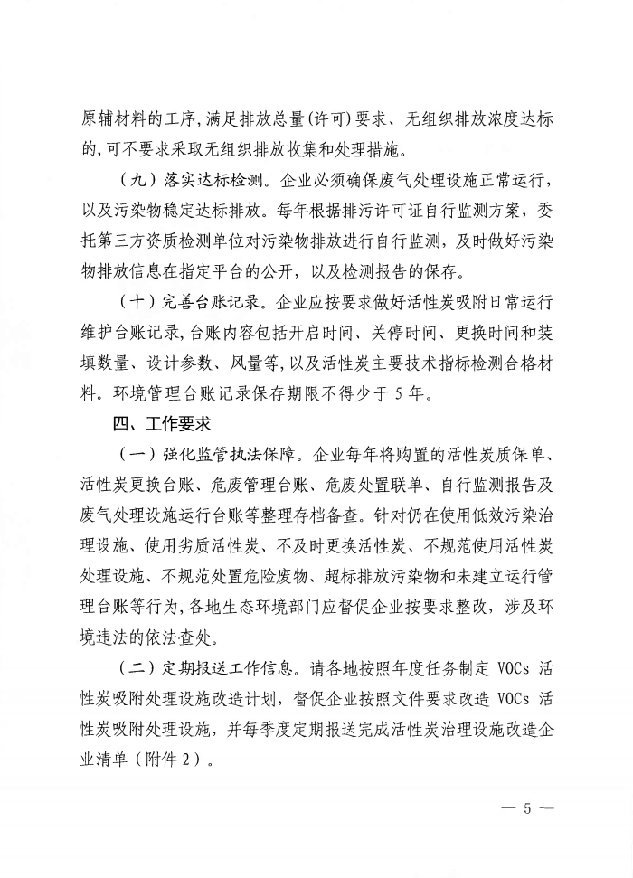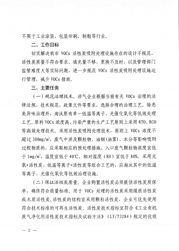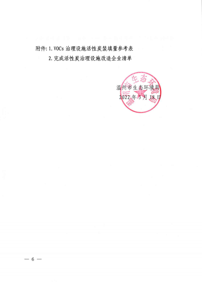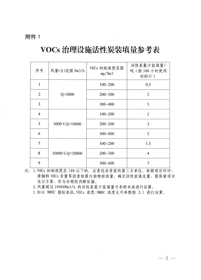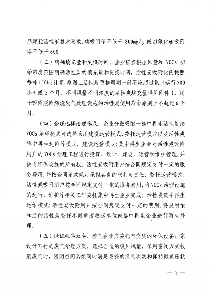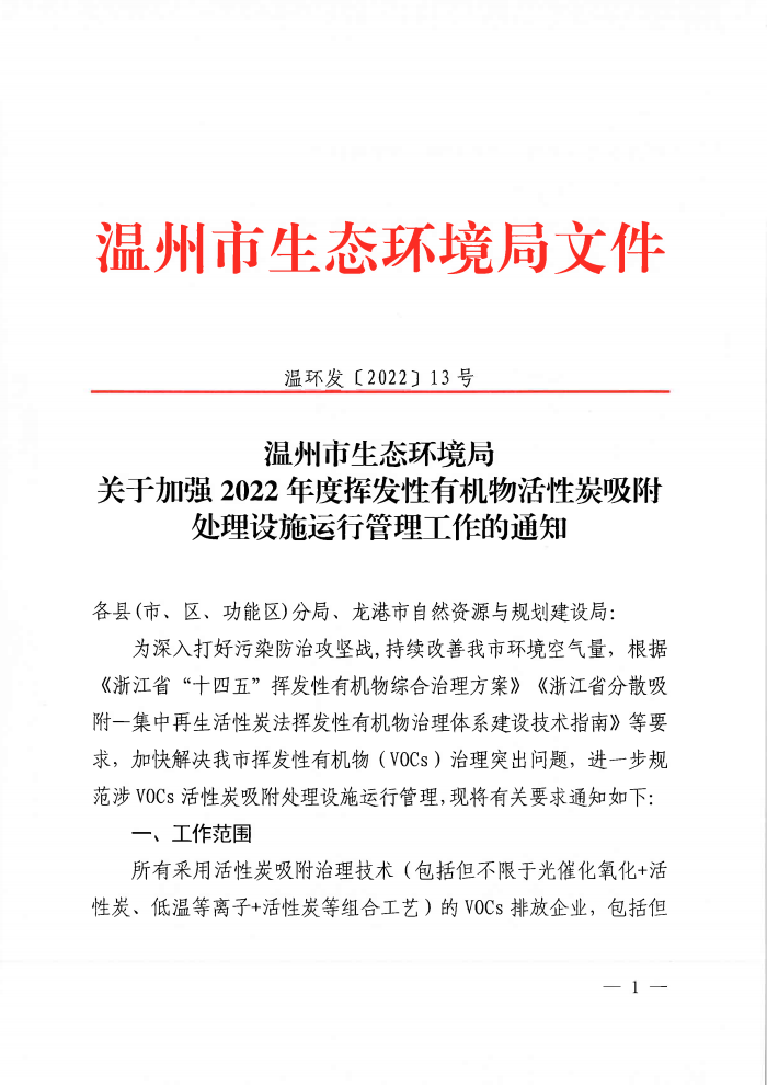 為加快解決VOCs治理突出問題,進一步規(guī)范涉VOCs活性炭吸附處理設施運行管理,溫州市生態(tài)環(huán)境局印發(fā)了《關于加強2022年度揮發(fā)性有機物活性炭吸附處理設施運行管理工作的通知》。其中規(guī)定活性炭吸附比例按照每噸150kg計算,原則上活性炭更換周期一般不應超過累計運行500小時或3個月,企業(yè)分散吸附—集中再生活性炭法VOCs治理模式可選擇采用建設運營模式、委托運營模式以及活性炭集中再生運維等模式。