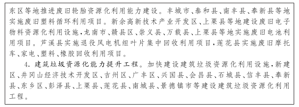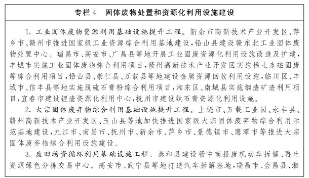 (七)持續(xù)推進(jìn)固體廢物處置設(shè)施建設(shè)。聚焦煤矸石、粉煤灰、尾礦(共伴生礦)、冶煉渣、工業(yè)副石膏、建筑垃圾、農(nóng)作物秸稈、鋰渣等大宗固體廢物,實(shí)施一批規(guī)模化、高值化、高質(zhì)化利用項(xiàng)目。推進(jìn)國家級大宗固體廢棄物綜合利用示范基地和國家級工業(yè)資源綜合利用基地建設(shè),帶動固體廢物處置及綜合利用設(shè)施建設(shè)。完善建筑垃圾回收利用政策,加強(qiáng)建筑垃圾精細(xì)化分類及資源化利用,鼓勵建設(shè)國家級建筑垃圾資源化利用示范城市,提高建筑垃圾資源化再生利用產(chǎn)品質(zhì)量和市場使用規(guī)模。支持南昌、吉安等地建設(shè)國家級廢舊物資循環(huán)利用體系示范城市。加快完善廢舊物資回收網(wǎng)絡(luò)體系,建設(shè)一批規(guī)?;?、網(wǎng)絡(luò)化、智能化的廢舊物資回收基礎(chǔ)設(shè)施。探索鋰渣處理處置系統(tǒng)方案,統(tǒng)籌做好鋰渣消納及資源化利用設(shè)施建設(shè)。新建和改造一批再生資源加工利用項(xiàng)目,推進(jìn)報(bào)廢機(jī)動車等廢棄物分類利用和集中處置,引導(dǎo)再生資源加工利用項(xiàng)目集聚發(fā)展。(省發(fā)展改革委、省工業(yè)和信息化廳、省住房城鄉(xiāng)建設(shè)廳、省商務(wù)廳、省自然資源廳、省生態(tài)環(huán)境廳按職責(zé)分工負(fù)責(zé))