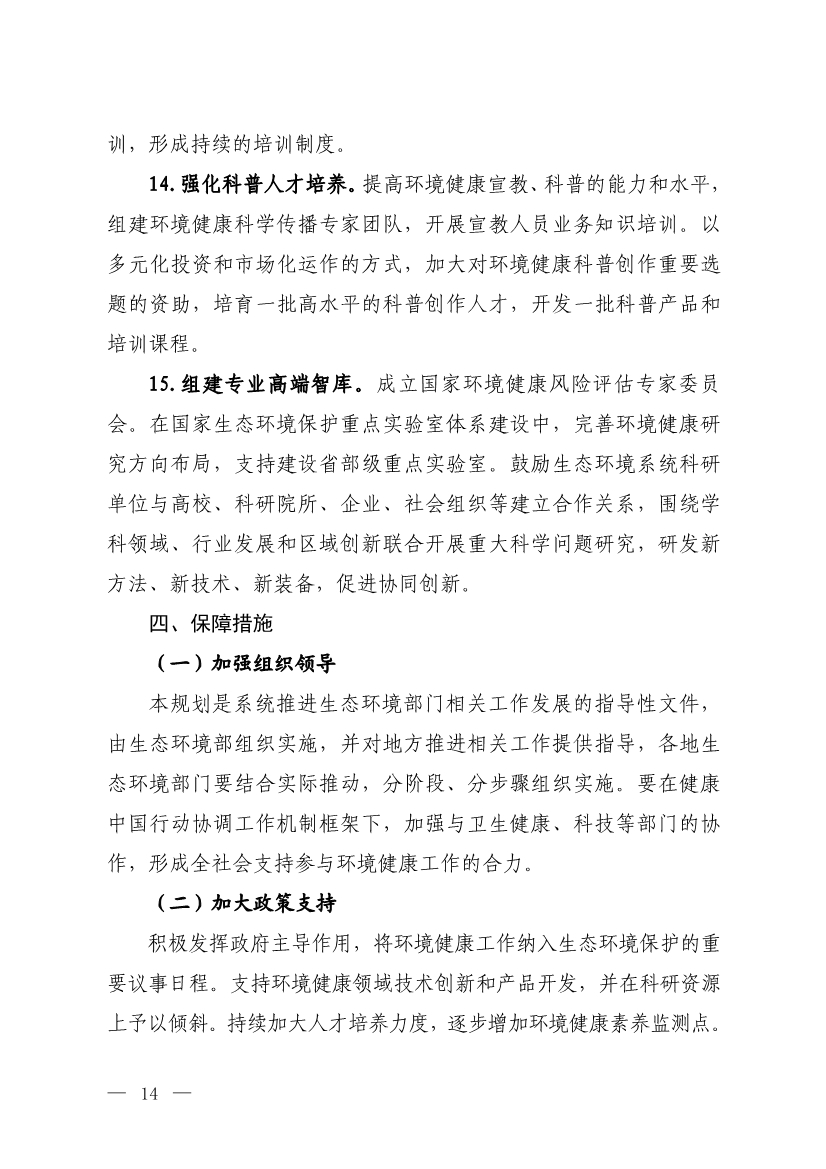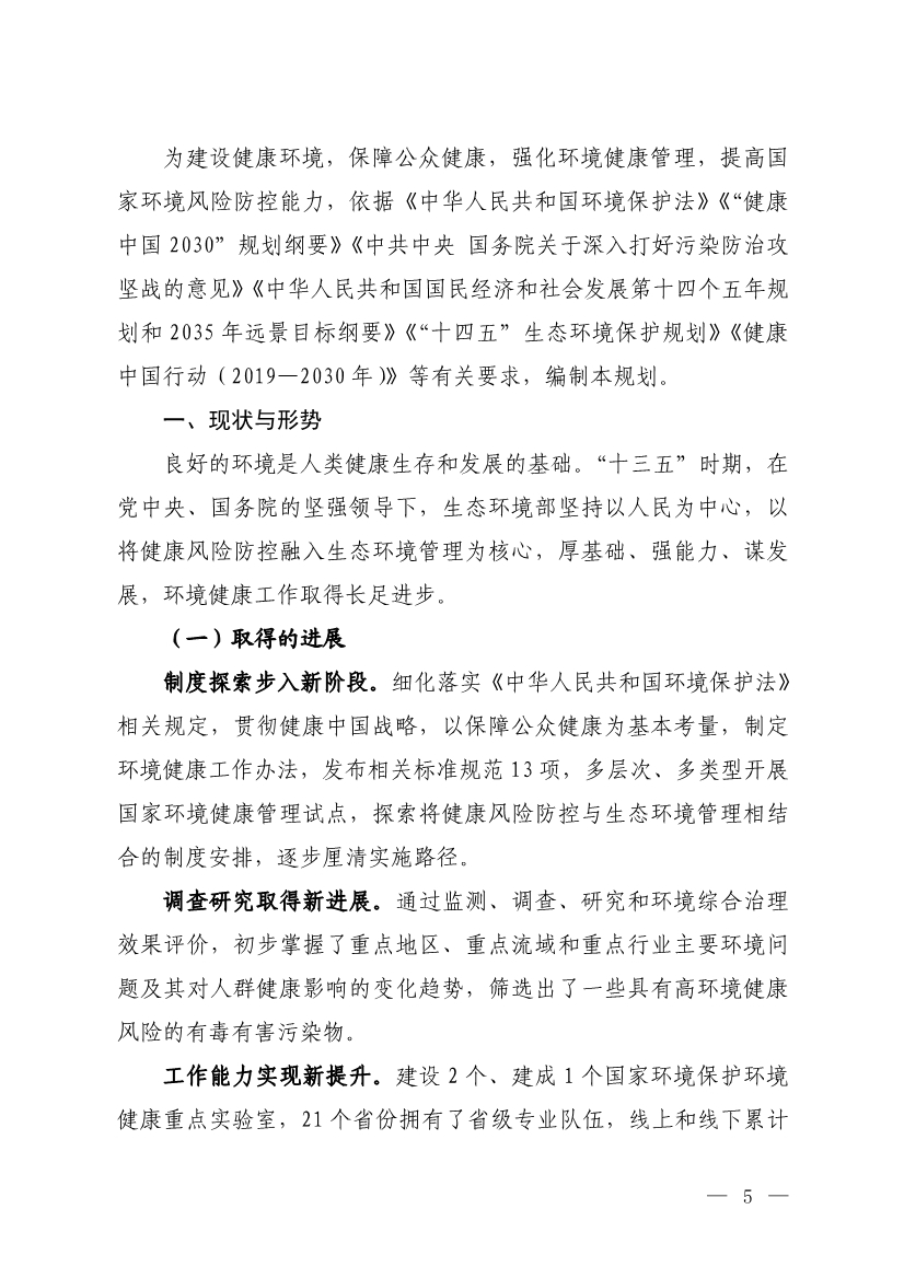 為貫徹落實《中華人民共和國環(huán)境保護法》《“健康中國2030”規(guī)劃綱要》《中共中央 國務(wù)院關(guān)于深入打好污染防治攻堅戰(zhàn)的意見》《“十四五”生態(tài)環(huán)境保護規(guī)劃》等有關(guān)要求,建設(shè)健康環(huán)境,保障公眾健康,強化環(huán)境健康管理,提高國家環(huán)境風(fēng)險防控能力,我部制定了《“十四五”環(huán)境健康工作規(guī)劃》?,F(xiàn)印發(fā)給你們,請結(jié)合實際貫徹落實。