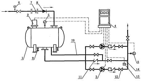 5——壓力傳感器;10——小流量保壓管;15——出水口流量計; 20——進水口流量計。