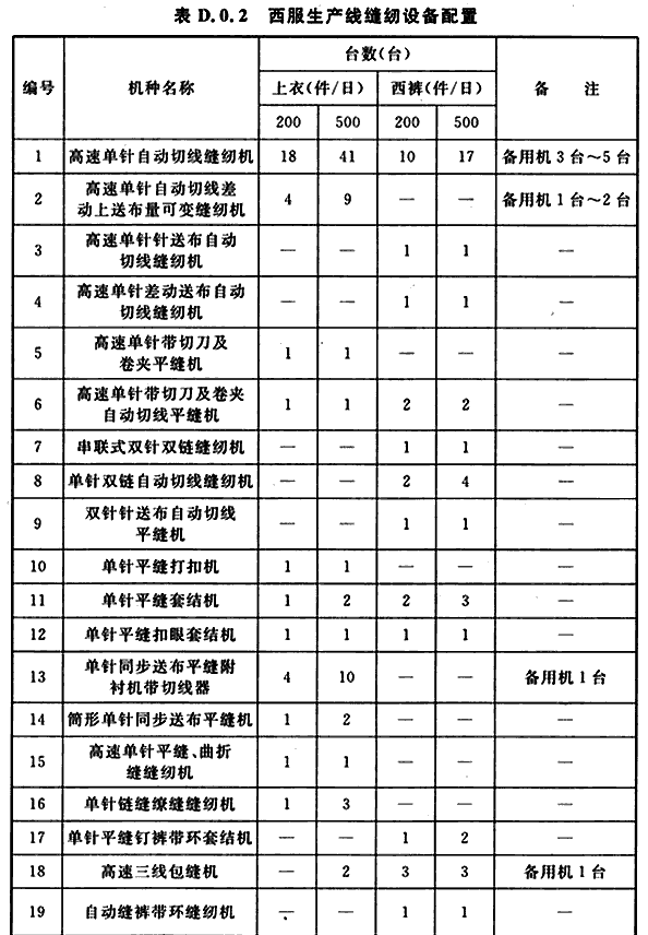 D.0.2 西服生產(chǎn)線縫紉設(shè)備配置可按表D.0.2選用。